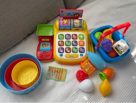 Kassakone laskee ostokset näytölle, setelit, kolikot ja kortti. Kauppatavarat ja ostoskori.