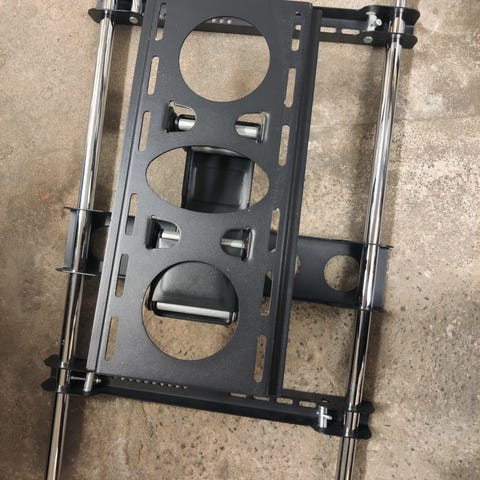Musta metallinen säädettävä teline, joka soveltuu erilaisiin tv- kiinnityksen seinälle. Telineessä on useita kiinnityspisteitä ja säädettävä mekanismi, joka mahdollistaa kulman ja korkeuden säätämisen. Rakenne on tukeva ja tarkoitettu kestävään käyttöön.