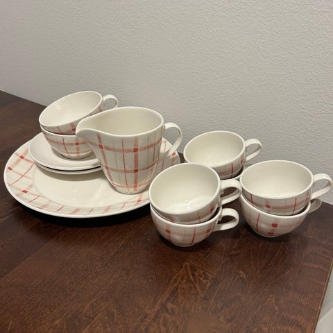 Kolme syvää lautasta, neljä isoa lautasta, kuusi pienempää lautasta