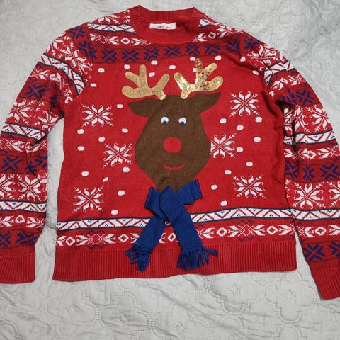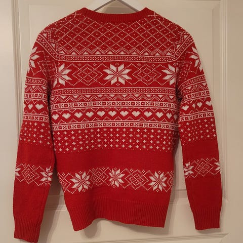 Punainen joulupaita. On aika nukkainen, niitä ei ole yritetty poistaa nukanpoistajalla, mutta osa varmasti lähtisi sillä. Kokolappu näyttää 38/40, mutta paita on ilmeisesti kutistunut pesussa ja nyt vastaa paremmin kokoa 36. Myös sivusaumat ovat jotenkin vinossa. Paita on materiaaliltaan 80% lampaanvillaa ja 20% polyamidia.