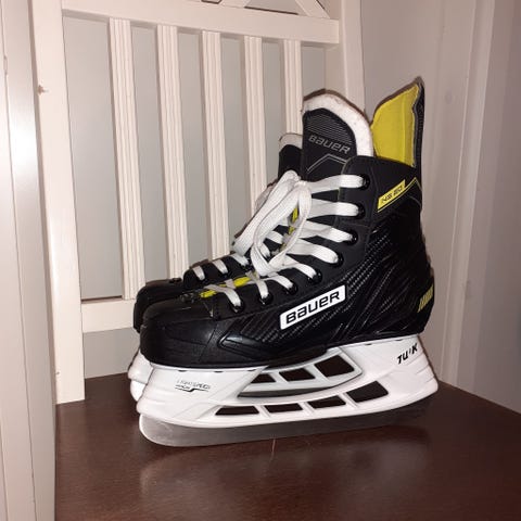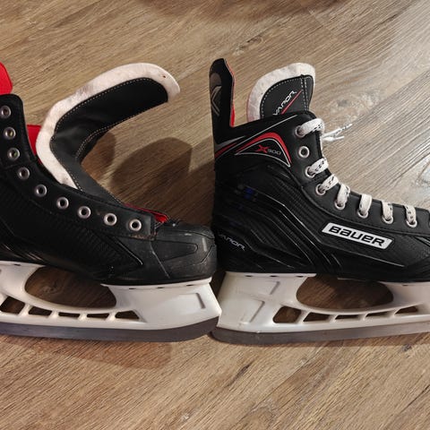 Luistimet Bauer Supreme MX3. Ei ole tarkkaa tietoa koosta, noin 42,5-43. Itsellä jalka 43,5 ja nämä hiukan pienet. Etuläpät todella repaleiset.