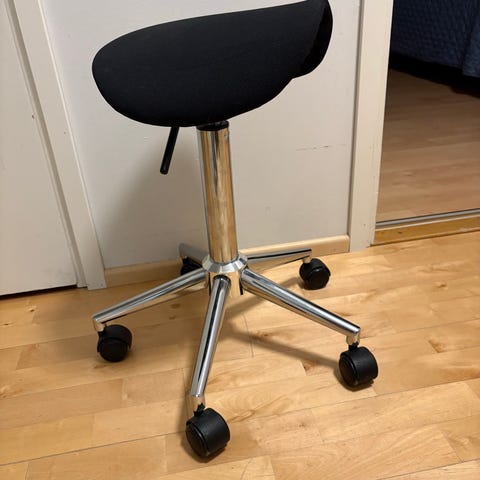 Iskun tyylikäs satulatuoli, jossa istuinosa saarniviilua ja jalkaosa mustaa alumiinia. Tuoli on erinomaisessa kunnossa. Säädettävä. Kotimainen.