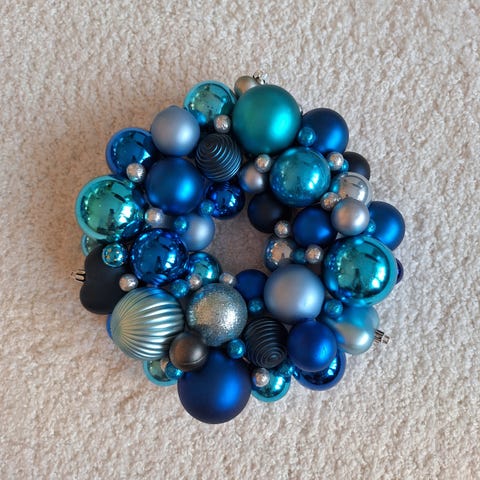 Käsityönä tehty hopeinen joulupallokranssi, halkaisija 32cm ja korkeus 9cm. Kaikki kranssin tarvikkeet on kuumaliimaa lukuunottamatta kierrätettyä.
