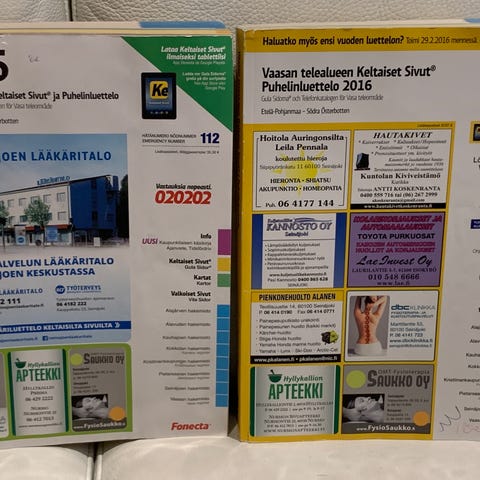 Hyväkuntoinen vanha puhelinluettelo. Vaasan telealue. Luettelot vuosilta 2015 ja 2016.
