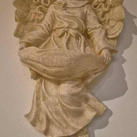 Herkkä ja kaunis enkeli patsas. Muutama lommo pinnassa sattui silmään, kts. kuvat. Itseä ei ole häirinnyt kun muutenkin tehty vanhan näköiseksi.