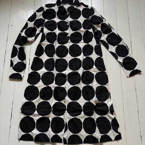 Käyttämätön Marimekko Trina Pienet Kivet -mekko. Trina-mekko on puuvillapopliinista valmistettu paitapuseromekko, jossa on luonnonvalkoisen ja mustan sävyinen Pienet Kivet –kuosi. Mekossa on metallinapitus sekä irrotettava vyö, sivusaumataskut ja A-linjainen leikkaus polvenpituiseen helmaan.