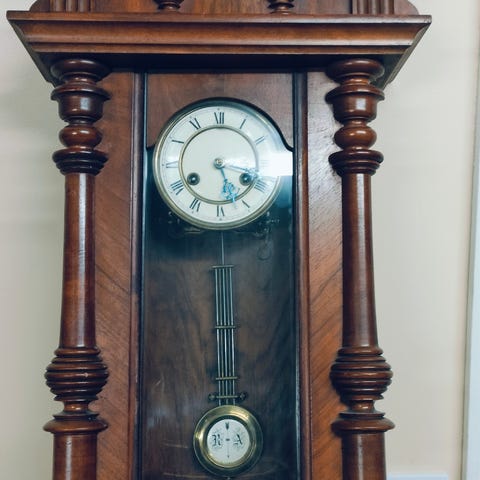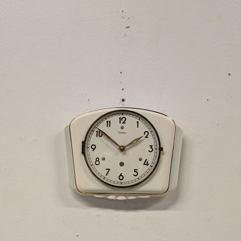 Kaunis keraaminen seinäkello. Kellosepän huoltama ja toimiva. Avainkin on tallessa. Kuvussa pientä löysyyttä, mutta pysyy paikallaan.