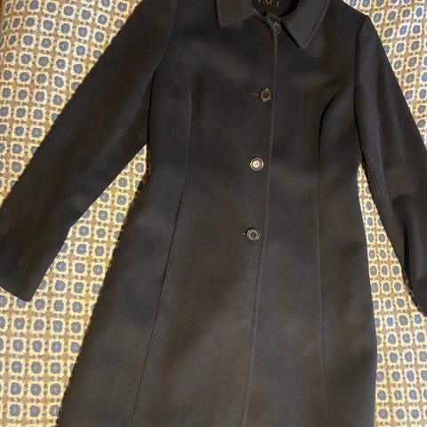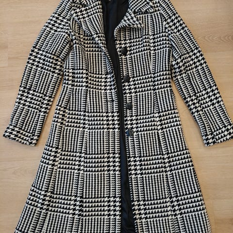 Käyttämätön Your Face villakangastakki, koko 38, väri tummansininen. Materiaali 50 % villa ja 35 % polyesteria. Takki on malliltaan kevyesti viistottu, siinä on pystykaulus, kiinnitys 6 nepparilla, taskut ja vyö. Pituus olkapäältä helmaan 84 cm ja hartiaväli 41 cm.