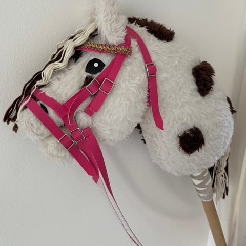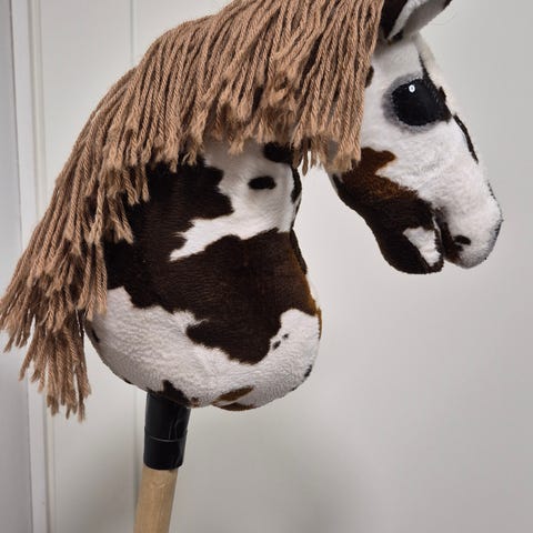 Muuten hyväkuntoinen keppihevonen, mutta kankaassa pieni, melko huomaamaton reikä.