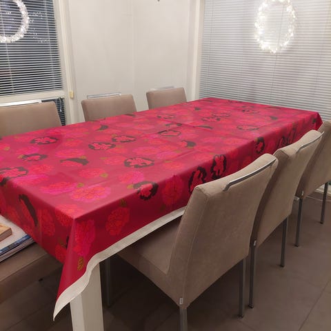 Laadukkaasta pellava puuvilla sekoite kankaasta ja Marimekon upealla mustavalkoisella puuvillakankaalla somistettu laudeliina . Ammattimaisesti siistillä kädenjäljellä kiitettävästi ommellut laudeliinat tyylikkääseen kotiin . Mukava lahja sellaiselle jolla on jo kaikkea. Iso koko leveys 60 cm ja pituus.143 cm. Tuote seloste kankaasta 45% pellavaa ja 55% puuvilla. Pesu 60 asteessa. Hakusana laudeliina pellava Marimekko