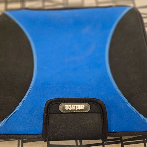 Neopreeninen kannettavan tietokoneen suojakotelo mustana ja sinisenä. Suojakotelon mitat ovat noin 30 cm leveys ja 27 cm korkeus. Suunniteltu suojaamaan kannettavaa tietokonetta naarmuilta ja pieniltä kolhuilta.
