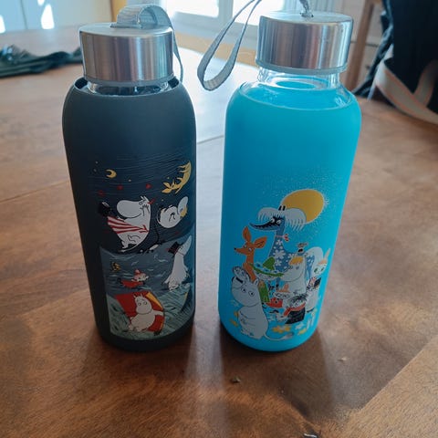 Laadukas ja pitkäikäinen juomapullo kierrätetystä alumiinista ja selluloosasta valmistetulla, kiinnitysrei'ällä varustetulla kierrekorkilla. Pulloa koristaa muumien seikkailut.