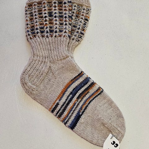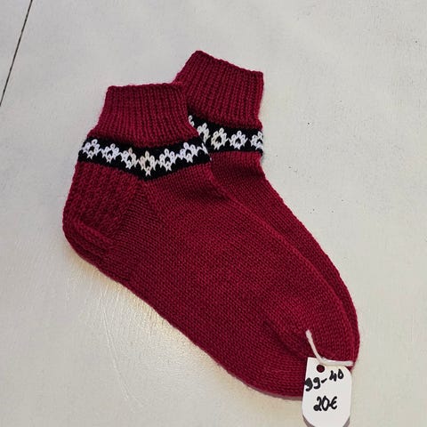 Äitini on kutonut villasukkia lähes koko ikänsä, ja nämä sukat syntyvät vuosikymmenten kokemuksella. Jokainen pari on uniikki, tarkasti tehty ja tarkoitettu kestämään käyttöä vuodesta toiseen. Sukat on kudottu laadukkaasta Novita 7 Veljestä langasta.