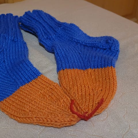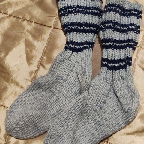 Siniset villasukat joissa varsissa harmaat raidat. Koko n. 28-29, 4-5-vuotiaalle, 19cm kantapäästä kärkeen