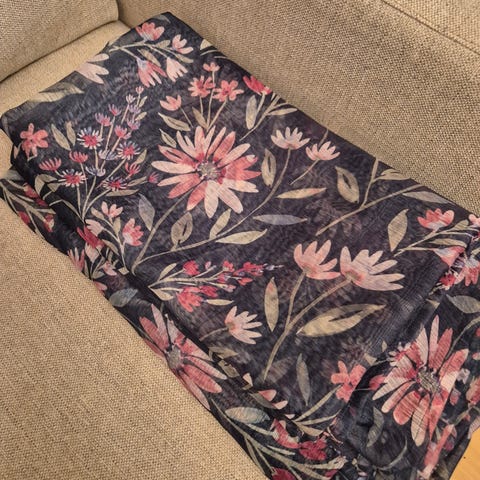 Myynnissä kaksi pitkää ja kapeaa verhoa. Verhoissa on punatulkun kuvia. Toisessa verhossa yläosassa mahdollisesti kiinnitysklipsun tekemiä pieniä reikiä. Näistä kuva.