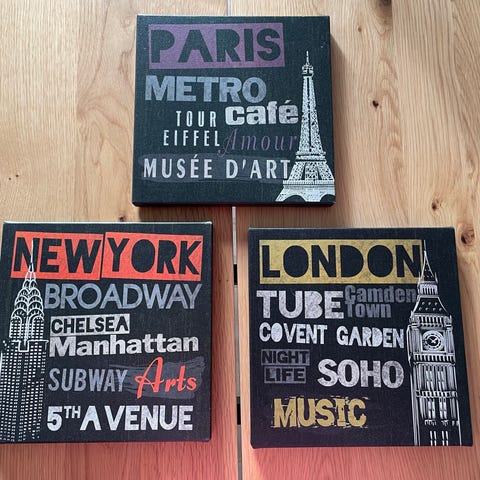 Tästä kaupunkien todelliselle ystävälle upeat kaupunkitaulut kiertoon kolmen settinä; London, New York & Paris.
