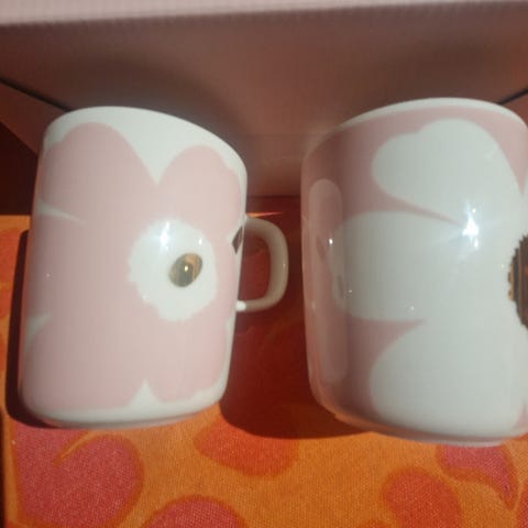 Marimekko Oiva Voikukka mukit, joissa on voikukkakuviointi. Mukit ovat valkoisia ja valmistettu keraamisesta materiaalista. Setti sisältää kaksi kappaletta.