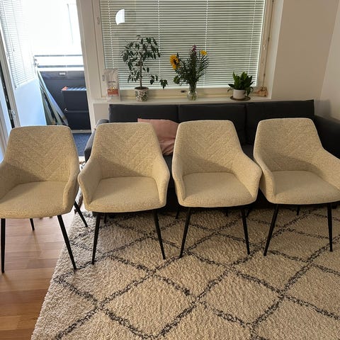 Neljä ruokatuolia. Alkuperäinen hinta maksettu 6 kuukautta sitten 198 EUR: https://jysk.fi/ruokailutila/ruokapoydan-tuolit/ruokapoydan-tuoli-ejstrup-beige-kangas