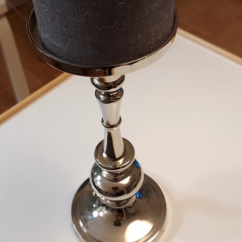 Pentikin käyttämätön kynttilänjalka. Materiaali antiikkihopeoitu messinki. Korkeus 28cm. Nouto/postitus.