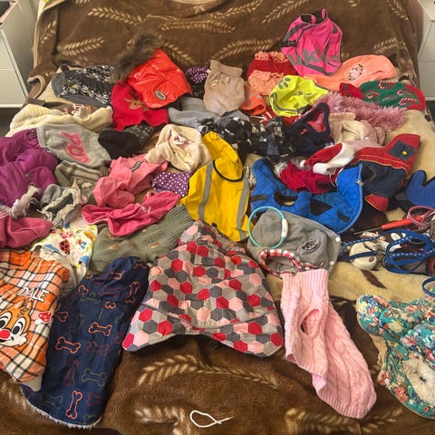 Myydään kuvan mukainen setti, mielellään kaikki kerralla. Vaatteet noin 25-30 kokoa, ollut käytössä 3kg koiralla. Huppari, Rukan fleece ja itse tehty islantilaisneule.