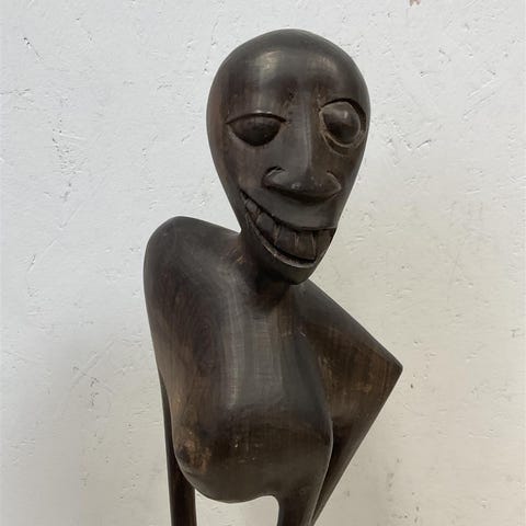 Myynnissä upea, käsin veistetty puuveistos, joka esittää abstraktisti toisiaan syleilevää paria. Se tunnetaan usein nimellä "Ikuinen Rakkaus" tai "Lovers' Sculpture" ja on tyyliltään tyypillisesti itäafrikkalaista, mahdollisesti eebenpuusta tai muusta tummasta ja vaaleammasta puusta valmistettu.