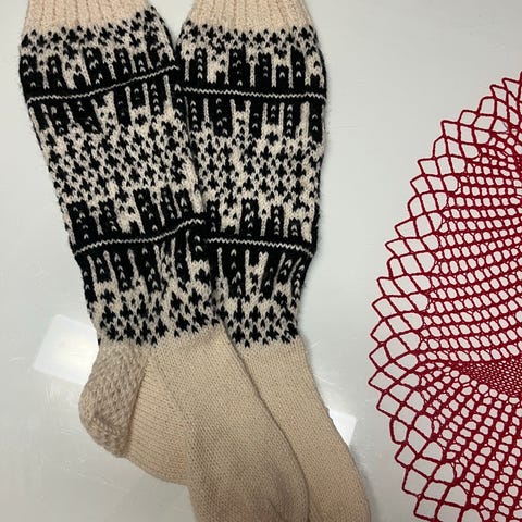 Uudet käsin kudotut pitkävartiset villasukat. Lavan pituus 25cm. Sopivat koolle 38-39. Nouto/normi postitus. Lanka 70-75% villaa. Pesu 40 astetta.