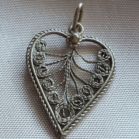 70-luvun hopeariipus, filigraaniriipus Tallinnasta. Koko noin 22 x 15 mm. Virolainen design, filigraani kiehkura kuvio ja pienet pallot. Leimat riipuslenkin kyljessä: neuvostoliittolainen nimileima ja hopealeima, harvinainen hopeapitoisuus 916. Kerrassaan upea vintageriipus, kaunis hopean patina.
