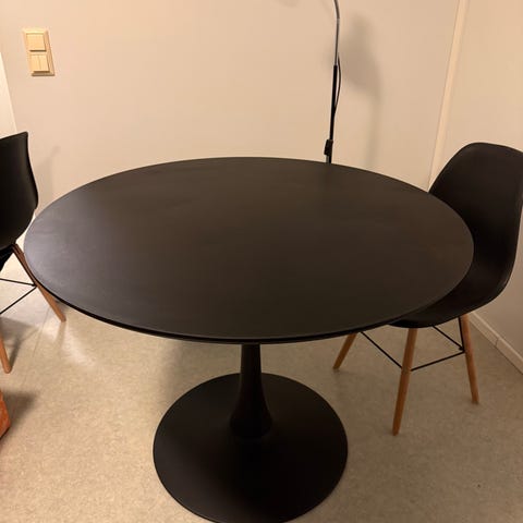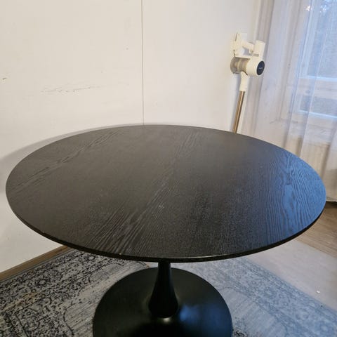 Hyväkuntoinen tukeva pyöreä ruokapöytä. Halkaisija 100cm. Paikoin pinnallisia kolhuja (kts kuva 4). Yleisilme kuitenkin siisti. Jalan saa irti kuljetusta varten.