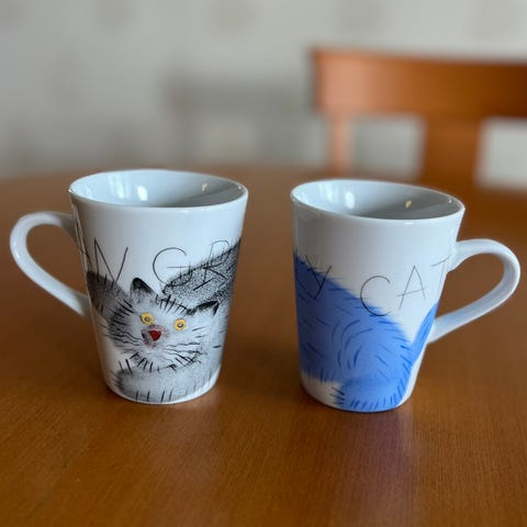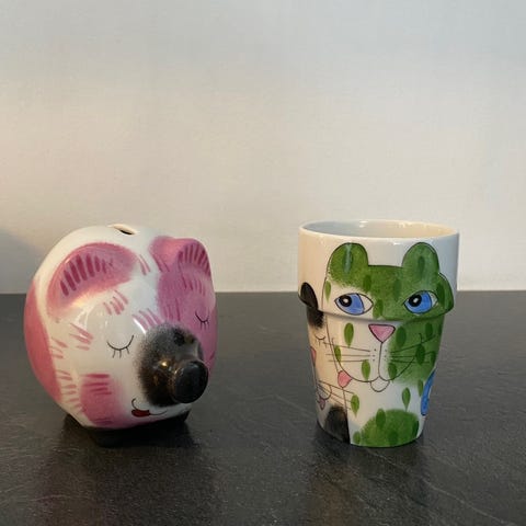 Tällainen muki kahden kisun kuvan kera, käsin maalattuna: Voi käyttää kylmillä juomilla koska ei ole korvaa, tai lasina. Kunto on kuvien mukainen hyvä.