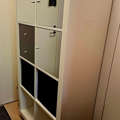 Ikea Expedit Kallax hyllykkö 4 x 4. Lisäksi 3 kpl valkoisia säilytyslaatikoita. Voi olla, että neljäkin, en ihan näe tuonne sängyn alle nurkkaan, että onko sielläkin yksi piilossa.