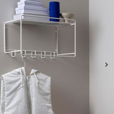 Seinään kiinnitettävä hyllykkö, moitteettomassa kunnossa. Mukana tulee kuvassa näkyvät neljä koukkua, lehtiteline, hylly ja 1 korttipidike.