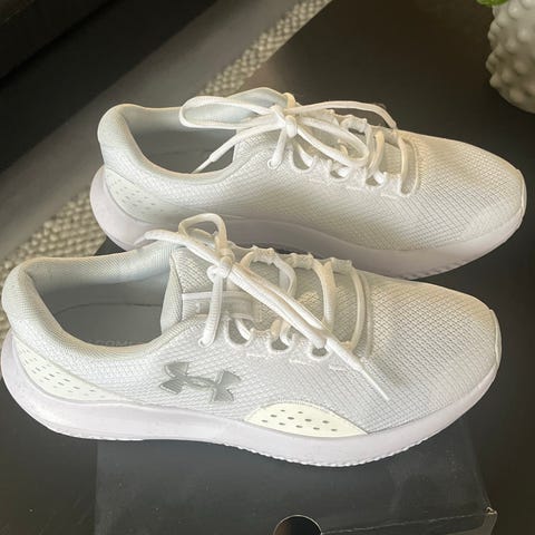 Under armour -merkkiset kokovalkoiset lenkkarit, koko 38. Pari kertaa koulun liikuntatunnilla käytetty, eikä juuri kulumaa, mutta valkoinen kangas otti heti osumaa. Ei ole yritetty pestä, näistä saa varmaan aivan uuden näköiset puhdistamalla.