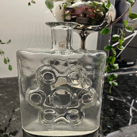 Riihimäen Lasi lasipullo, jossa on koristeelliset kohokuvioidut kuviot. Pullo on valmistettu kirkkaasta lasista ja siinä on suorakulmainen muoto. Sopii koriste- tai säilytyskäyttöön.