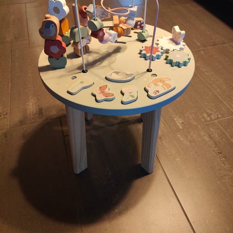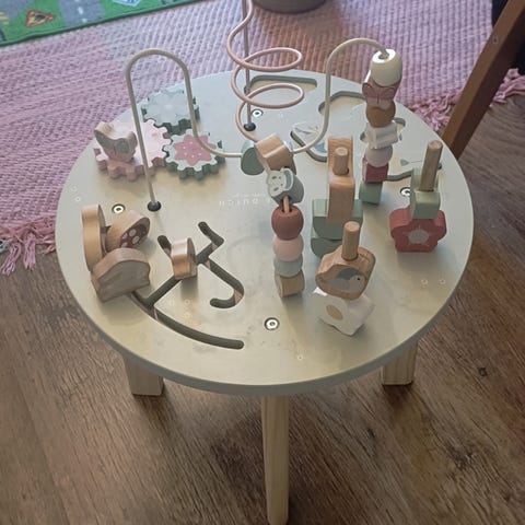 Little Dutch lasten leikkipöytä, jossa puujalat ja useita leikkielementtejä pöytälevyllä. Sopii lasten leikkiin ja motoristen taitojen harjoitteluun. Yksi pala puuttuu.