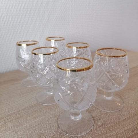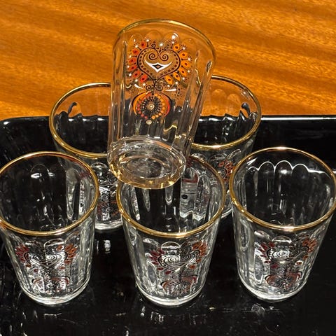 Snapsilasit ja vähän suuremmat lasit, joissa on erilaisia värillisiä kuvituksia vanhanaikaisista ajoneuvoista. Setti sisältää useita eri kokoisia laseja, jotka soveltuvat juomien tarjoiluun. Lasit ovat läpinäkyvää lasia. Kaikki yhteensä 5 euroa.