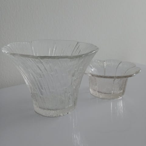 Pertti Kallioisen suunnittelema kirkas lasikulho / lasimaljakko / tuikkukippo. Korkeus 9 cm, halkaisija 12 cm. Kuin uusi.