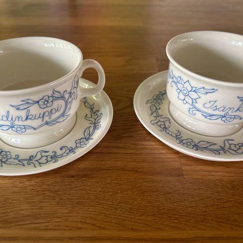 Virheettömät äidin ja isän kupit ja tassit, EP-malli, virheettömät. Kuppien halkaisija on 11 cm ja tassien 17 cm (kaakaokuppi), Arabian tuotantoa, piippuleima.