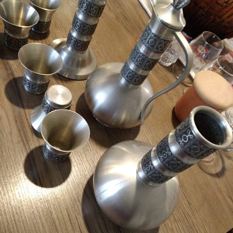Tinakannusetti korkilla ja kuudella snapsi kupilla.