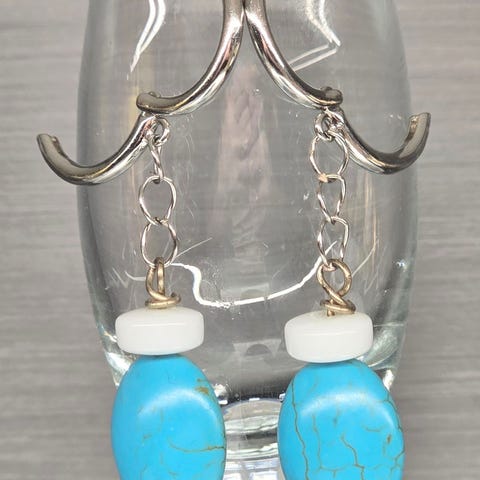 Useita erilaisia riippukorvakoruja, hopeidut koukut, materiaalit vaihtelevat simpukoita koru metalliin ja muoviin.