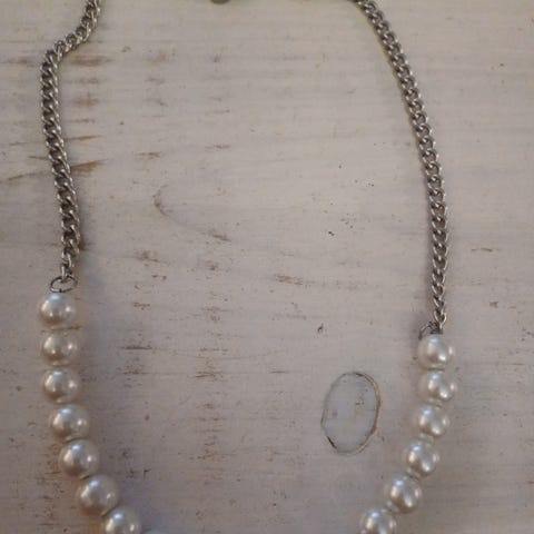 Helmet kaulakoru, jossa on helmistä valmistettu ketju ja muu materiaali yhdistettynä koriste-elementtiin. Kaulakorun väri on valkoinen helmien osalta ja koriste-elementti on kullanvärinen. Tuote soveltuu asusteeksi monenlaisiin tilaisuuksiin.