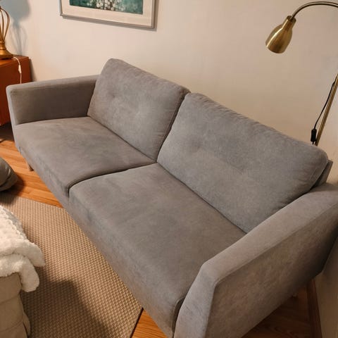 Myydään muuton alta pois musta samettinen 3-istuttava Karlskrona sohva (ovh. 450 EUR).