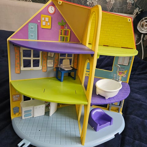 Löytyy lääkäriä, ostoskeskusta, taloa, matkailuautoa, puumajaa, junaa yms ja paljon hahmoja. Puumajassa on yksi keinu rikki, voi saada korjattua ei kyllä oo haitannut meidän leikkejä. Ostoskeskuksessa on laite jolla lapsi voi kuuluttaa sanomisiaan.