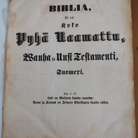 Biblia. Kovakantinen koko nahka teos. Kotelossa. Näköispainos 1886 laitoksesta. Painovuosi 1986. Varustettu 230:llä Gustave Doren piirtämällä kuvalla. Mitat:kork. 330mm, lev. 252mm,paks.71mm,paino4.4kg.