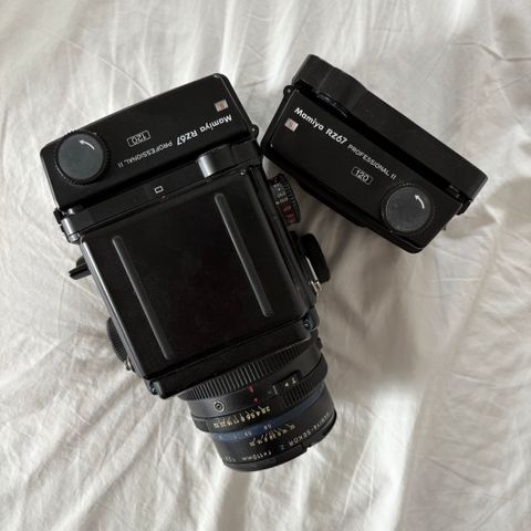 Hyväkuntoinen kompakti Mamiyan keskari, edellinen omistaja ostanut Kamerastoresta syksyllä 2024 ja ollut minulla vain kesästä asti, kiva kuvattava mutta 6x4,5 ei osoittautunut lopulta omaksi jutuksi. Valotusajat/suljin toimivat moitteettomasti. Etsimen kylkeen on raavittu merkintä edellisen omistajan nimestä, mutta jälki on haalea. Pohjan etureunassa on kuvan mukainen kolhu, mutta tämäkin täysin kosmeettinen. Mukana Mamiya 80 mm f2.8 Sekor C -objektiivi ja metalliset hihnapidikkeet.