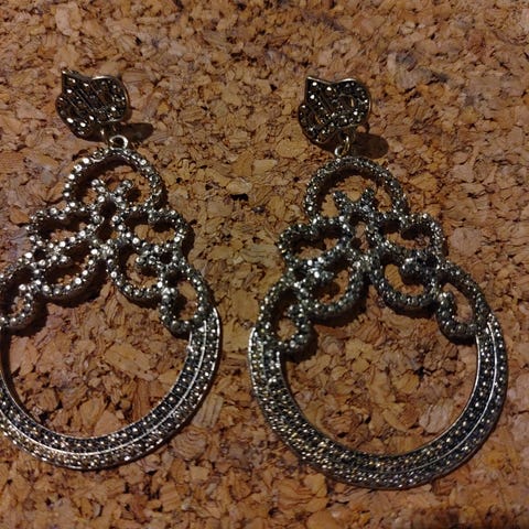 Metalliset korvikset, joissa mustat koristekivet. Korun pituus 6.5 cm, leveys 2.5 cm, uudet, käyttämättömät