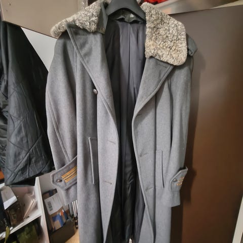 Sotilasvillakangastakki harmaata villakangasta. Takissa on kaksirivinen napitus ja vuori. Sopii kylmiin olosuhteisiin ja suojaa hyvin tuulelta ja kylmyydeltä.