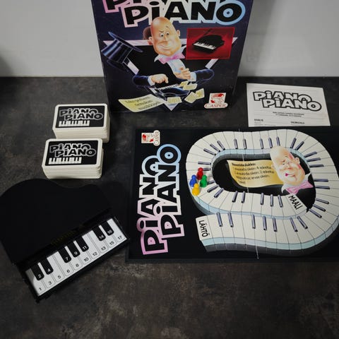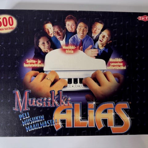 Myydään Musiikki Alias-peli. Peli musiikin maailmasta. Peli sisältää Musiikki-trivia, soitto- ja laulutehtäviä sekä musiikkisanastoa selitettäväksi. Ikäsuositus 10+, pelaajia 4+. Peliin kuuluvasta pianosta yksi jalka kadonnut, tilalle tehty puusta jalka, joka toimii, muutoin kaikki osat ovat tallessa. Pianoon tarvitaan kolme sormiparistoa, jotka ovat pelin mukana. Piano tarkistettu ja se soi, kun sitä soittaa. Peliä on pelattu jonkin verran. Kunto hyvä. Hinta 10 e. Hinnassa on huomioitu pianon puuttuva jalka.