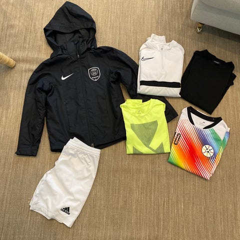 Nike Jalkapallo takki, koko 146/158. Jalkapallotakki on musta ja siinä on vetoketju ja vetoketjutaskut (2 kpl). Sisäkauluksessa on monivärinen raidallinen kuvio. Takissa on musta koristeraita, joka näkyy kuvissa. Jalkapallotakissa on Dri-FIT -teknologia ja Mercurial-merkintä hihoissa.