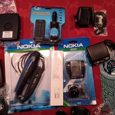 Kuvanmukaisia värikuoria, verkkovirtalatureita, autolatureita, handsfreetä ja datakaapeleita. Pääasiassa vanhempiin Nokialaisiin.