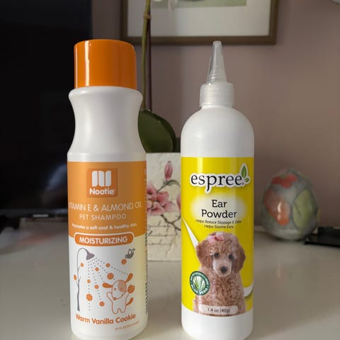Shampoot ja viimeistelysuihke paketti 30 €, John Paul Pet super bright, noin puolet jäljellä, isle of dogs keratin volume sulfate & paraben free shampoo lähes täysi, bio-groom super white coat brightener shampoo noin 1/4 jäljellä, Espree bright white shampoo yli puolet jäljellä, Espree viimeistelysuihke (estää sähköistymistä), sitä jäljellä noin 3/4.